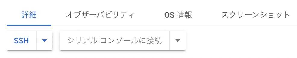 まずはGCPのVM一覧からVMの詳細画面へ進んでSSHボタンをクリック。SSHでVMにログインしよう。